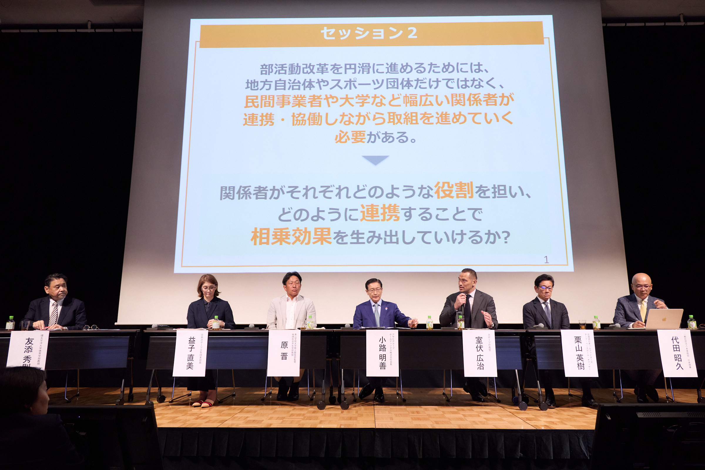 最初のセッション「これまでのスポーツ環境の課題」と「地域クラブ活動がめざすべき姿」について、それぞれの思いが語られた。