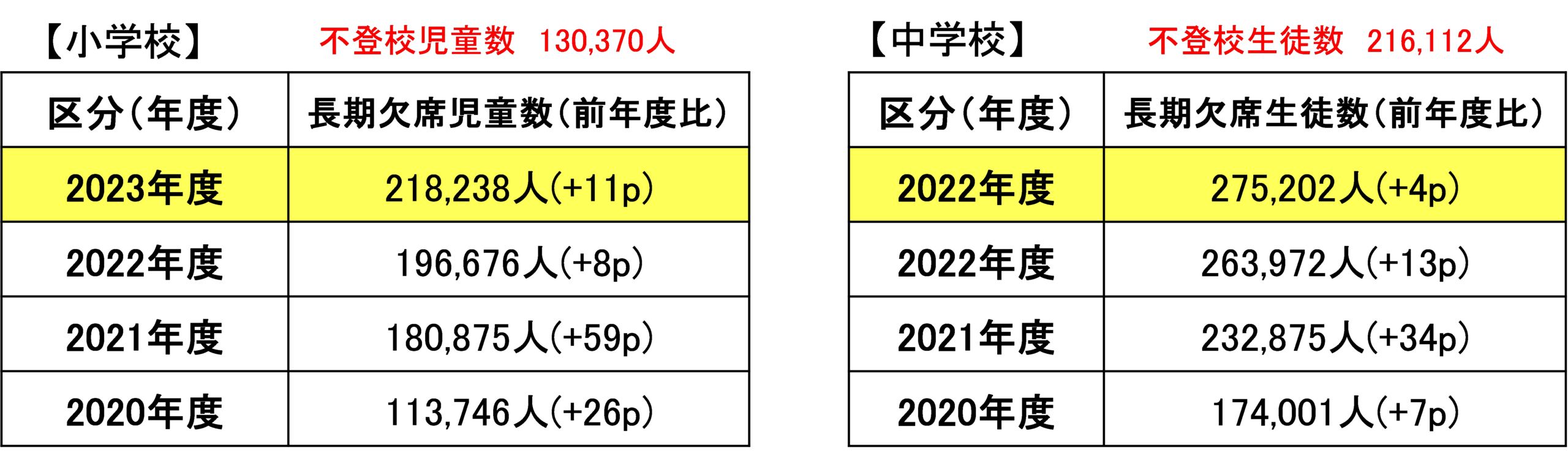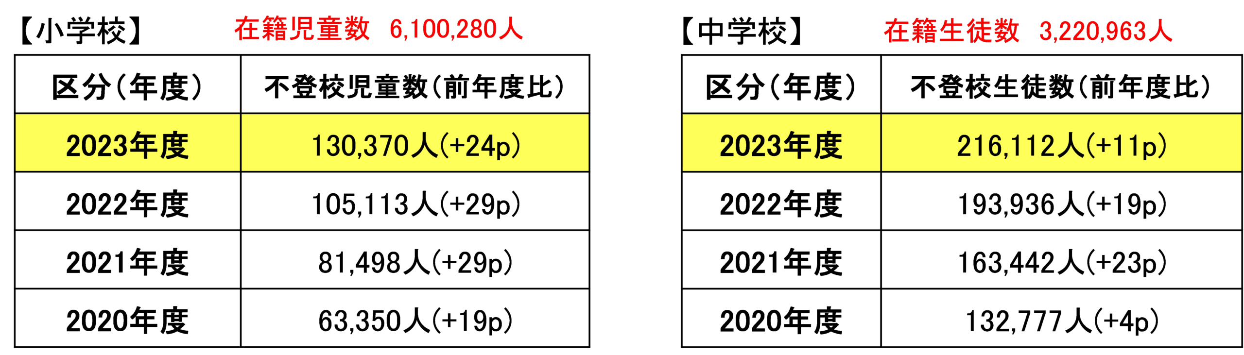 不登校の子どもの数はここ数年急増しており、文部科学省が毎年10月頃に開示するデータから、学校現場での深刻さがひしひしと伝わってきます。下記の表は、2020年度~2023年度の小学校と中学校の不登校の児童生徒数の推移を示したものです。
