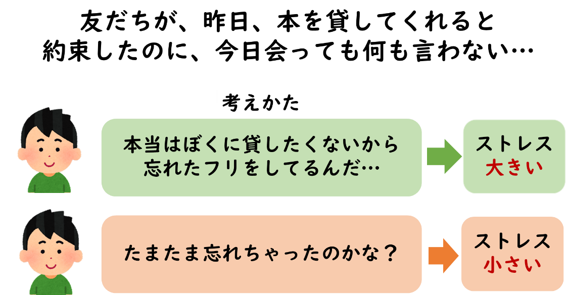 たとえば「友だちが、昨日、本を貸してくれると約束したのに、今日会っても何も言わない…」という出来事に直面した際に、「本当はぼくに貸したくないから忘れたフリをしてるんだ…」と考えると、ストレスが大きくなるだけではなく、人間関係も悪化してしまうかもしれません。