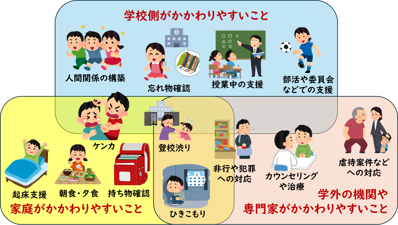 機能的、というのは、「上手く行きやすくて負担が少ない」といった意味合いです。保護者が学校で生じる問題にアプローチしようとするのは負担が大きいので、機能的ではないですし、教職員が家庭の問題にアプローチしようとすることも同様です。このような考え方は、不登校に限らず、特別支援教育、いじめ、非行など、さまざまな課題に対して、同じように活用することが可能です。