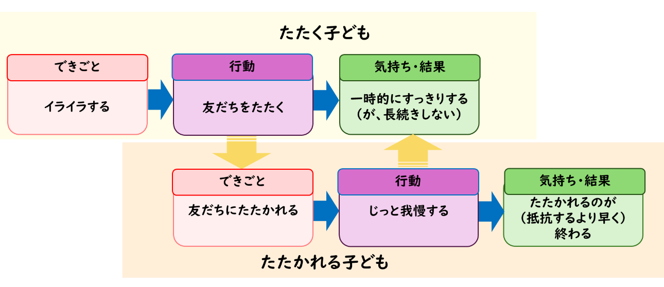 この図からわかるように、たたく子どもの行動が、たたかれる子どものきっかけとなっており、また、たたかれる子どもの行動が、たたく子どもの結果に影響していると考えることができます。
