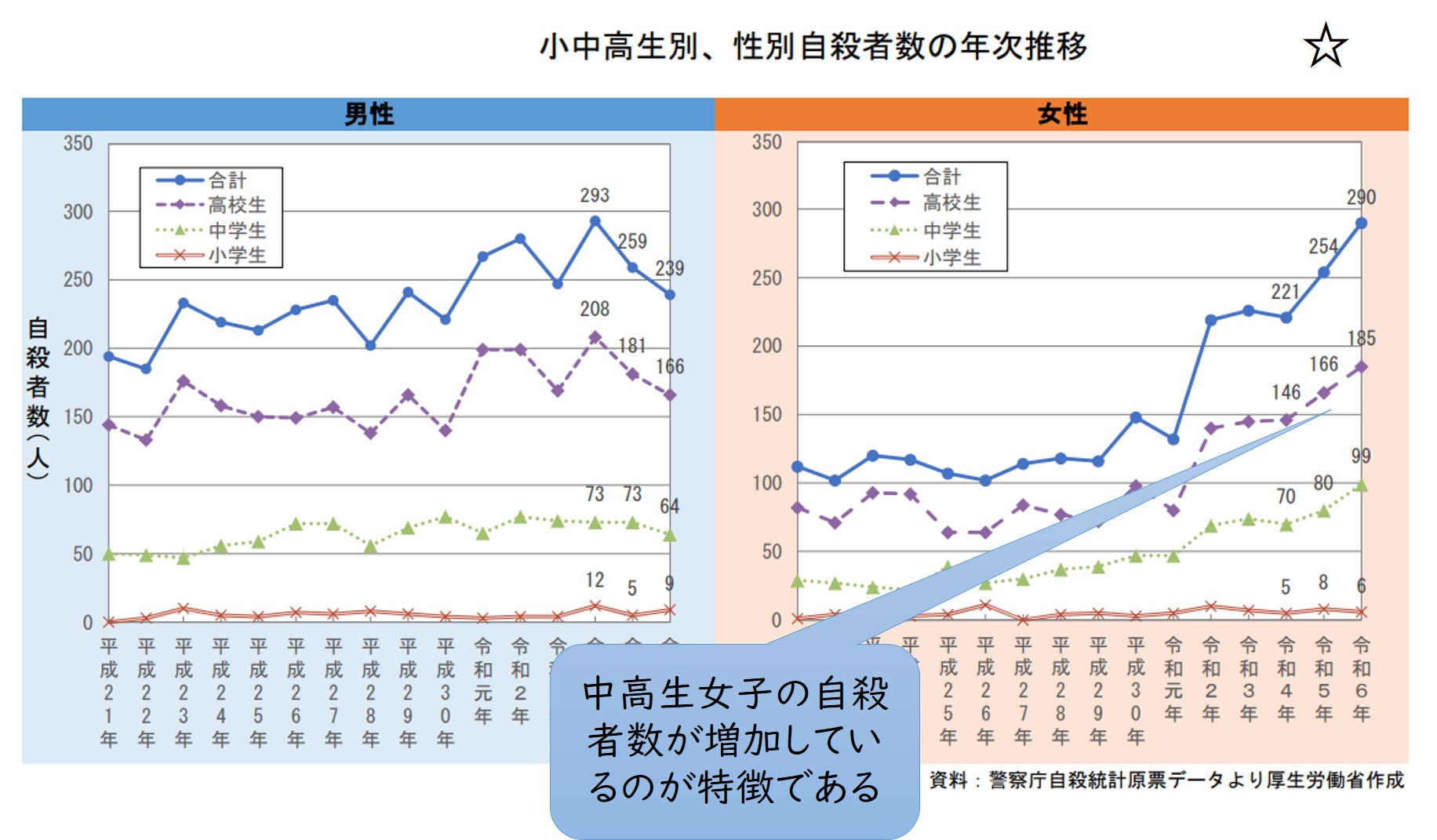長期休暇明けは、子どもたちの命にかかわる問題も増加します。小中高生の自殺者の年次別推移を見ると、全体的に自殺者は減っているにもかかわらず、子どもの自殺は増え続けています。特に、中高生の女子の自殺率が急上昇しており、これは見過ごすことのできない現実です。