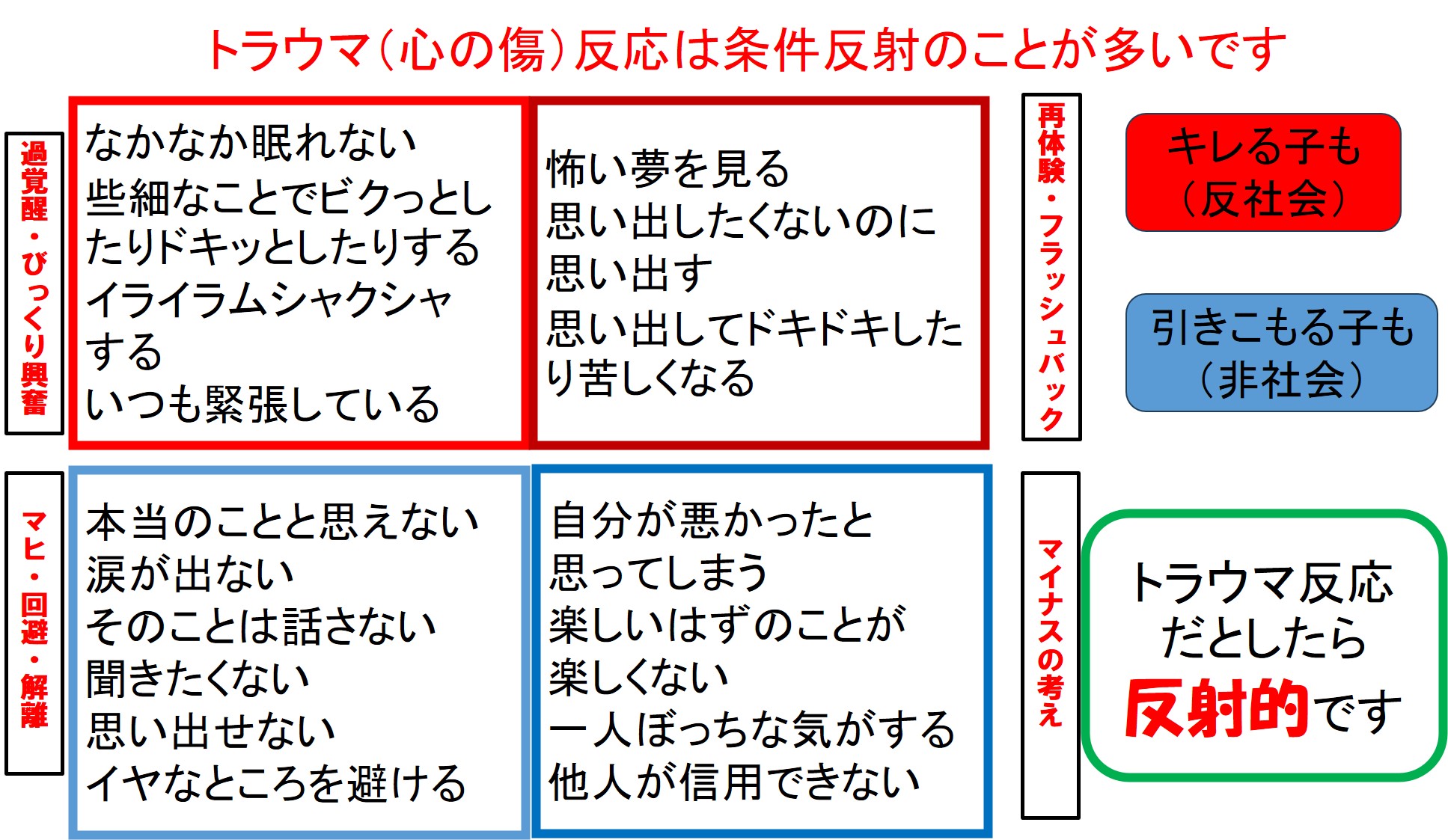 なぜ子どもたちは、自傷や不登校といった行動をとるのでしょうか?その背景には、何かの出来事によって生じた心の傷、つまりトラウマが関係していることがあります。トラウマは、人格の問題ではありません。それは、心身が自分を守るために起こす「反射」として現れます。これは、心的外傷後ストレス障害(PTSD)の特徴をまとめたものですが、大きく2つの反射が見られます。