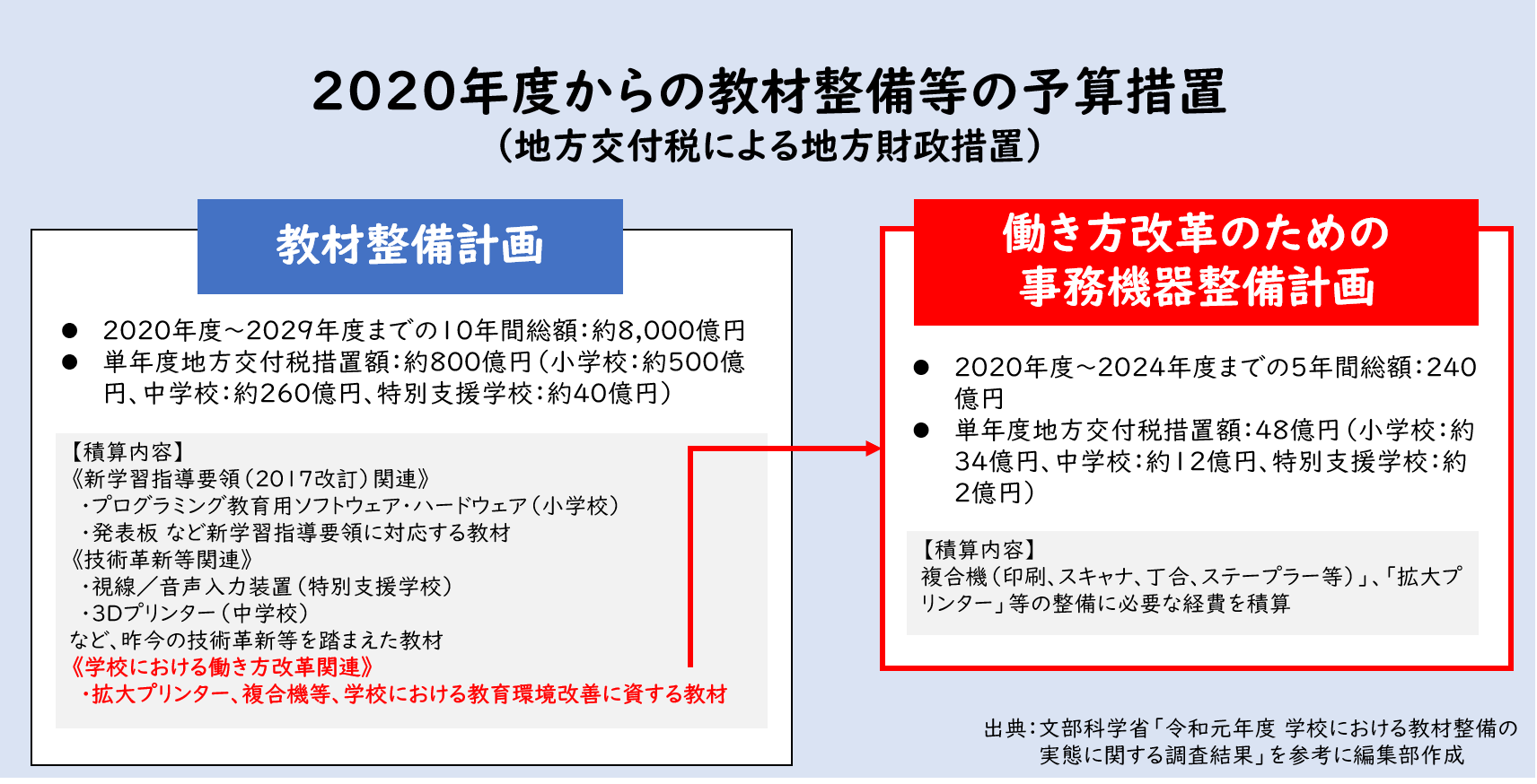 文部科学省は、自治体における学校教材の安定的かつ計画的な整備を促すため、複数年にわたる「教材整備計画」を策定しています。学習指導要領改訂や学校における働き方改革を踏まえ、2019年には「教材整備指針」を改訂し、これに基づき2020年度から財政措置の見通しとなる「教材整備計画」(※)を策定しました。