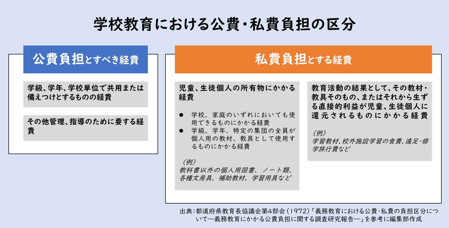 学校教育における公費と私費の負担区分については、1974年に都道府県教育長協議会が「公費、私費の負担区分に関する調査結果報告書」を公表し、その中で下記の考え方を示しています。