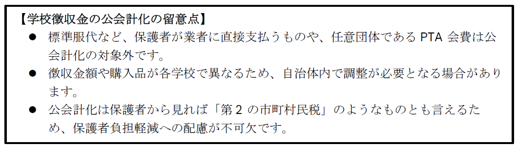 - 副読本、ワーク・ドリル、実験実習費、調理実習費などの教材費、校外活動費などについて、公会計化し、その徴収・管理を地方公共団体の業務として行うためのとりくみの推進。