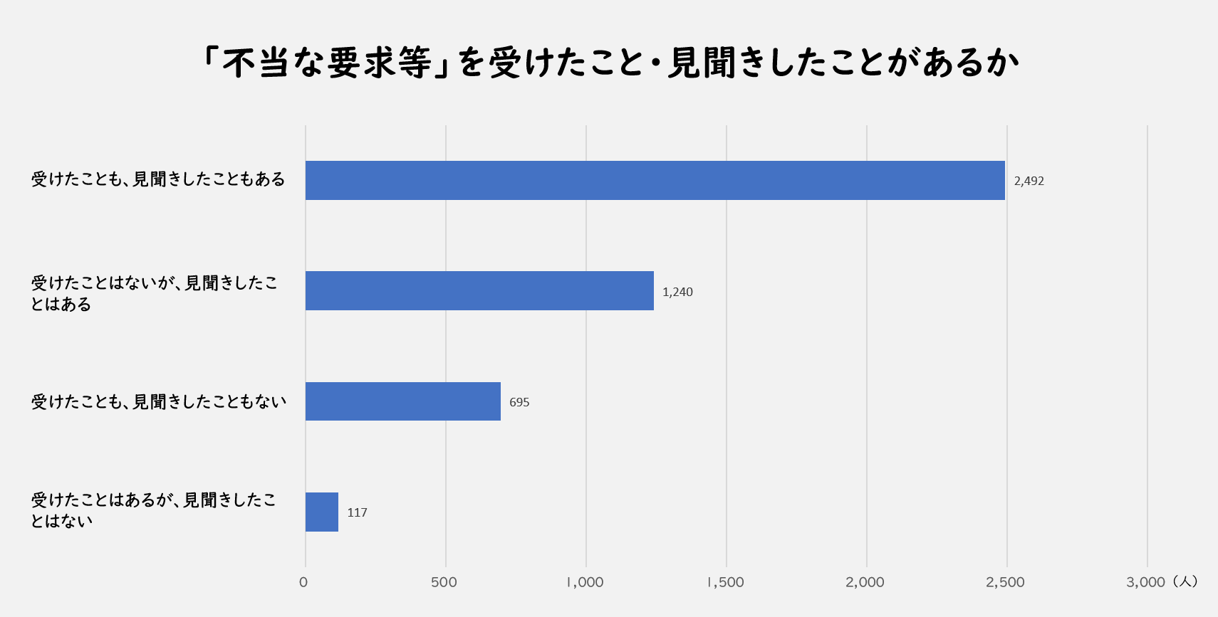 調査に回答した4,548名の教職員のうち、不当な要求や暴言などを自身が「受けたことがある」と回答したのは2,492人と半数を超え、「見聞きしたことがある」という方を合わせると8割以上と、大多数の教職員が「不当な要求等」を身近な問題として認識している状況がうかがえます。