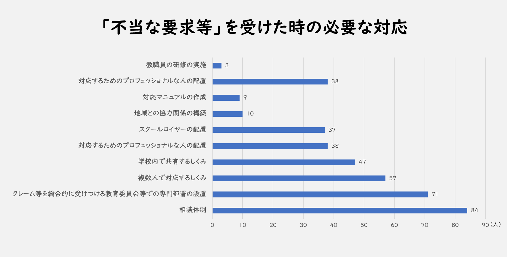 教職員を「不当な要求等」から守り、安心して教育活動に専念できる環境を整えるには、個々の努力に頼らない組織的な対応と支援が不可欠です。日本教職員組合の調査では、被害時に教職員が最も必要だと感じているのは「学校・教育委員会としての組織的な対応」でした。