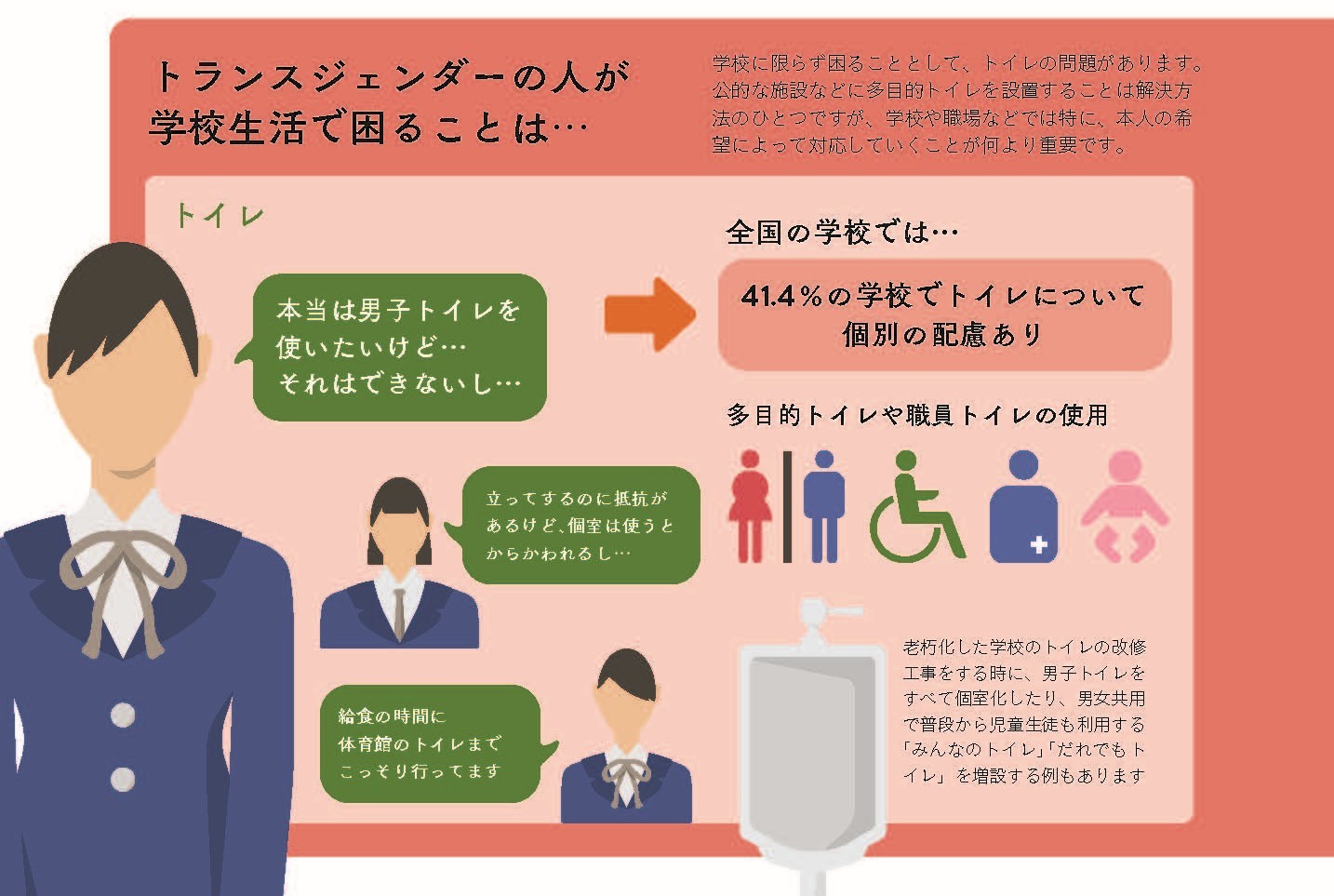 調査では全国の学校から606件の報告がありました(学校が把握している件数。誰にも言えず黙っている人は含まれない)。学校の対応としては、本人が自認する性別での制服の着用を認める(31.3%)、職員トイレや多目的トイレの使用を認める(41.4%)などの事例が多く報告されています。