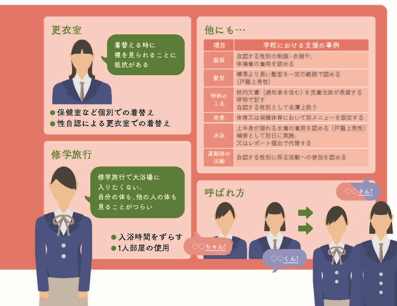 学校の対応事例の中には、個人の尊重が感じられるものもあります。「最初は多目的トイレを使用していたが、今は自然と自認する性のトイレを使っている」「修学旅行でクラスメイトが声をかけてくれ、個室が用意されていたが自認する性の大部屋で過ごした」といった例は、周囲が自認する性を受け入れることによって、のびのびと学校生活を送れることを示しています。