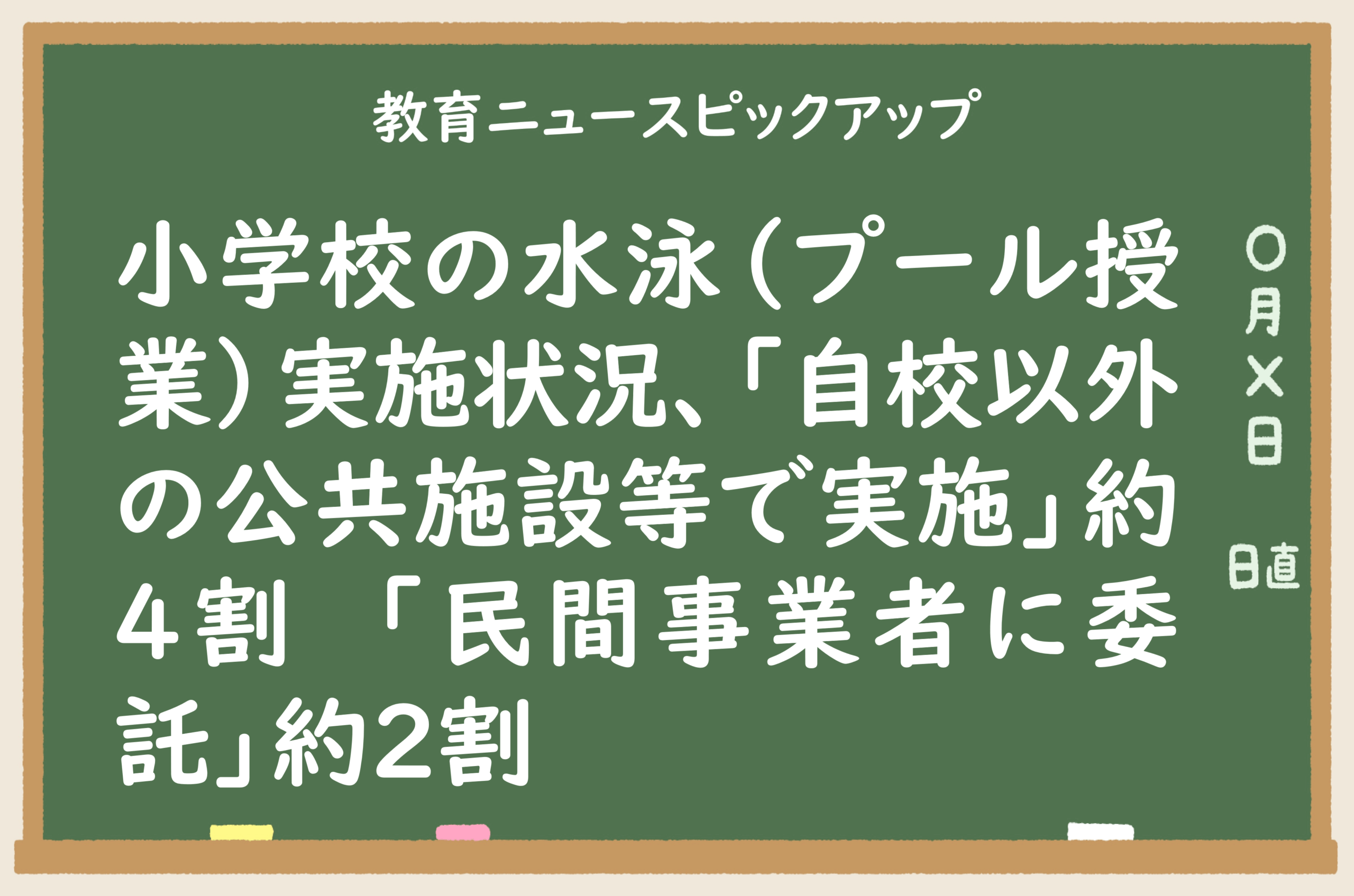 2025/07/25 教育ニュースピックアップ小学校の水泳(プール授業)実施状況、「自校以外の公共施設等で実施」約4割 「民間事業者に委託」約2割
