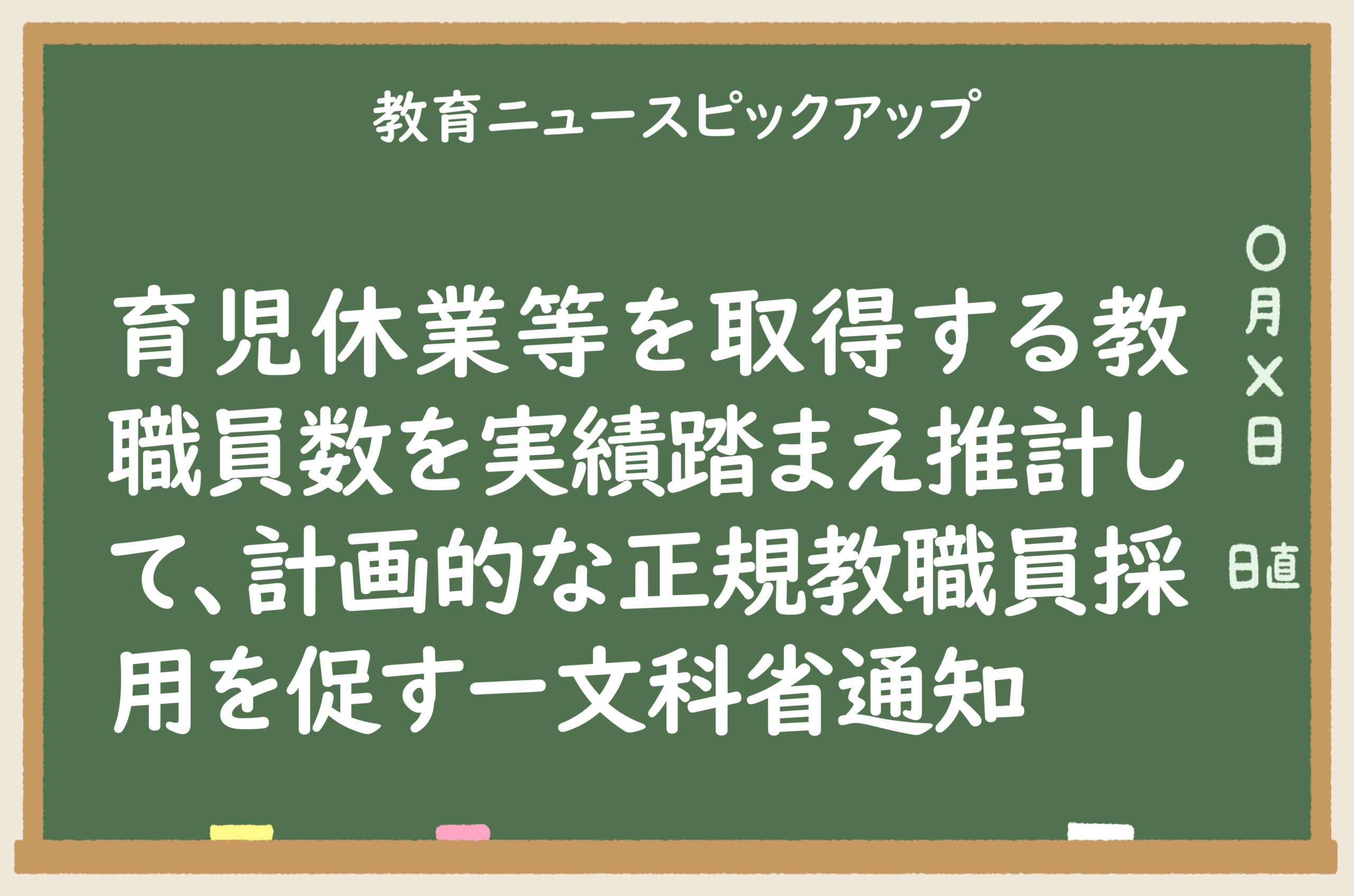 2025/07/28 教育ニュースピックアップ育児休業等を取得する教職員数を実績踏まえ推計して、計画的な正規教職員採用を促すー文科省通知