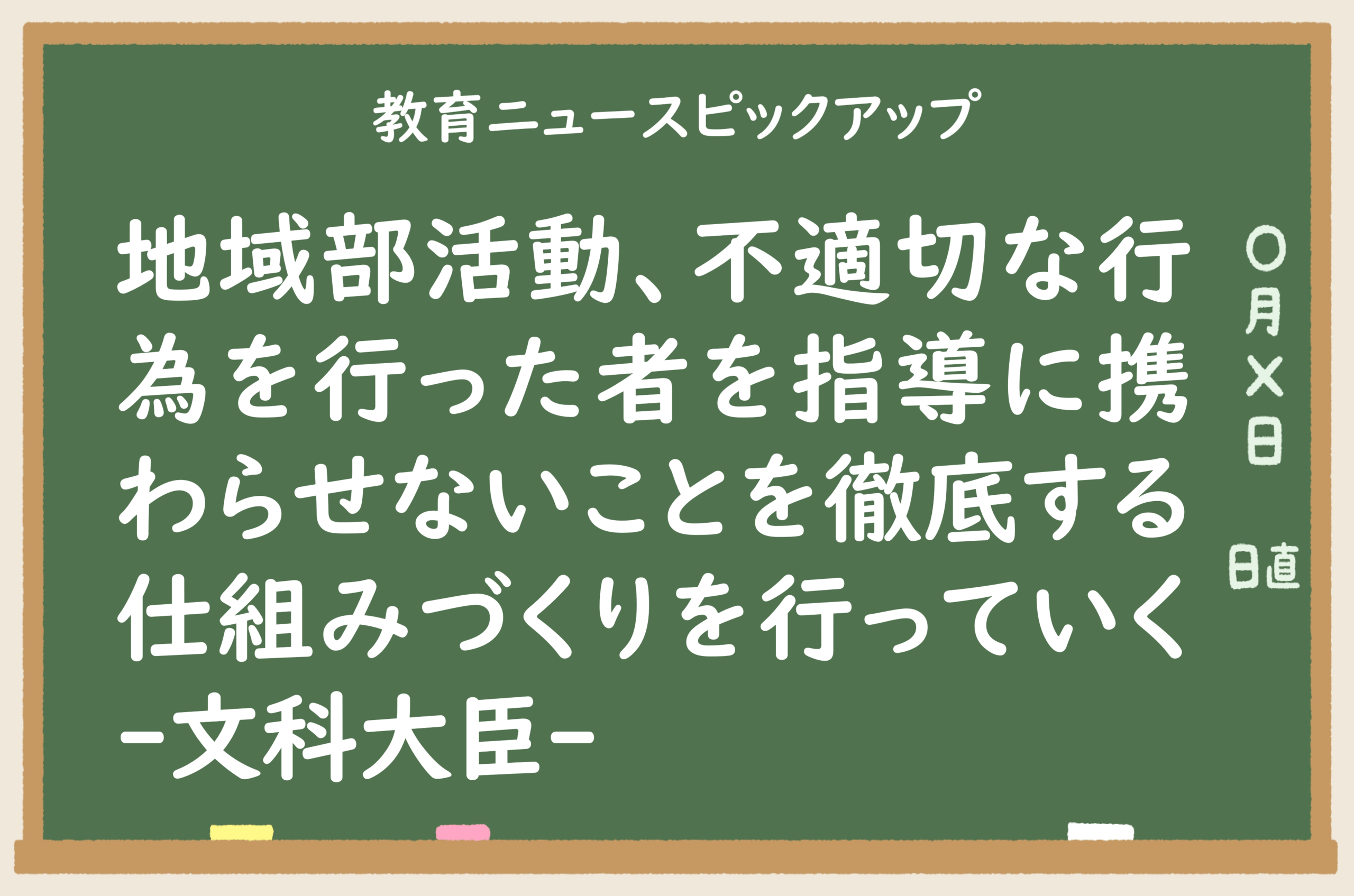 2025/06/27 教育ニュースピックアップ地域部活動、不適切な行為を行った者を指導に携わらせないことを徹底する仕組みづくりを行っていく -文科大臣-