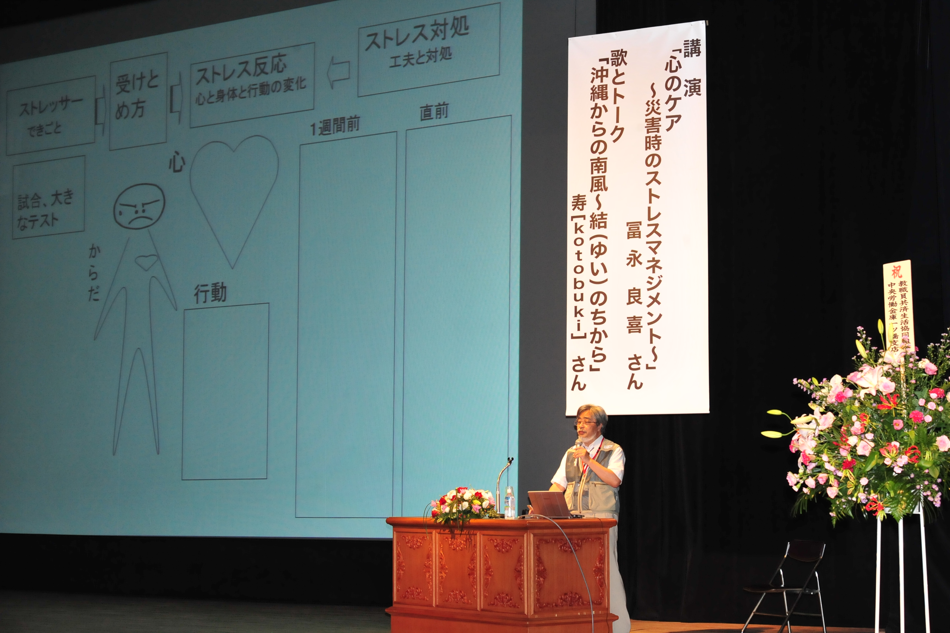 続いて、「心のケア ~災害時のストレスマネジメント~」と題して、冨永良喜さん(兵庫教育大学大学院教授)の講演がありました。「心のケアという言葉はよく使われますが、人は衝撃的な出来事に遭遇したときに、いろいろな心と体の変化が起きます。しかし、その変化を人は治めていくことができる『セルフケア』によって様々な反応を小さくすることができる、これが基本です。この『セルフケア』の力を周りの人がどうサポートするのか、それが『心のケア』です。逆にいえば自己回復していくプロセスを阻害するような二次的な被害というものがどういうことかを知ることも心のケアになります。」「震災後、安心・安全を十分に築いて、そして自分のペースで生活体験を表現して、その延長線上にそれぞれのペースでつらかったこと、そこをどうこれまでがんばってきたのかということを表現していくということを学校の中で少しずつ展開してみてはどうか。」と語られました。